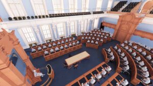 - Salon bleu : Alors que 125 députés se partageaient huit prises avant les rénovations, chaque pupitre dispose désormais d’une prise et d’un module de vote électronique.
